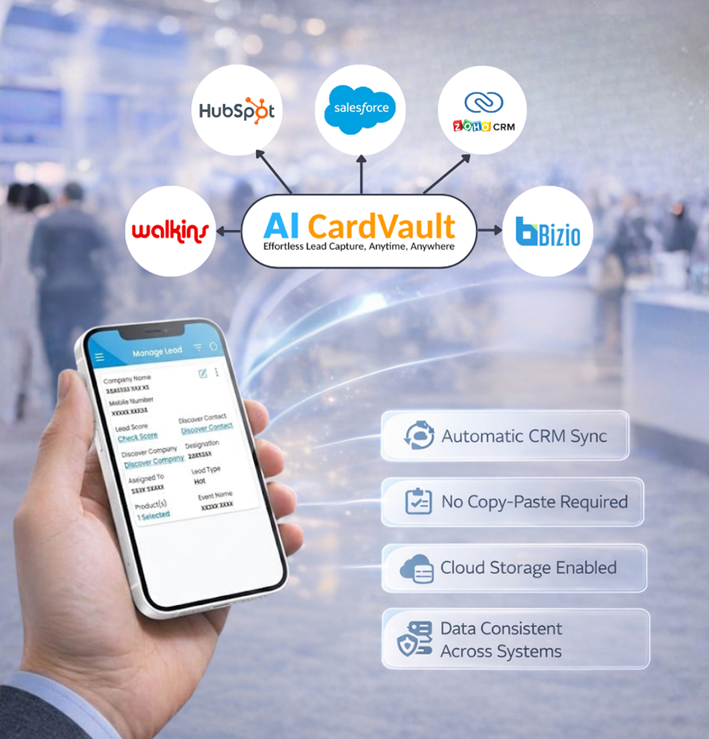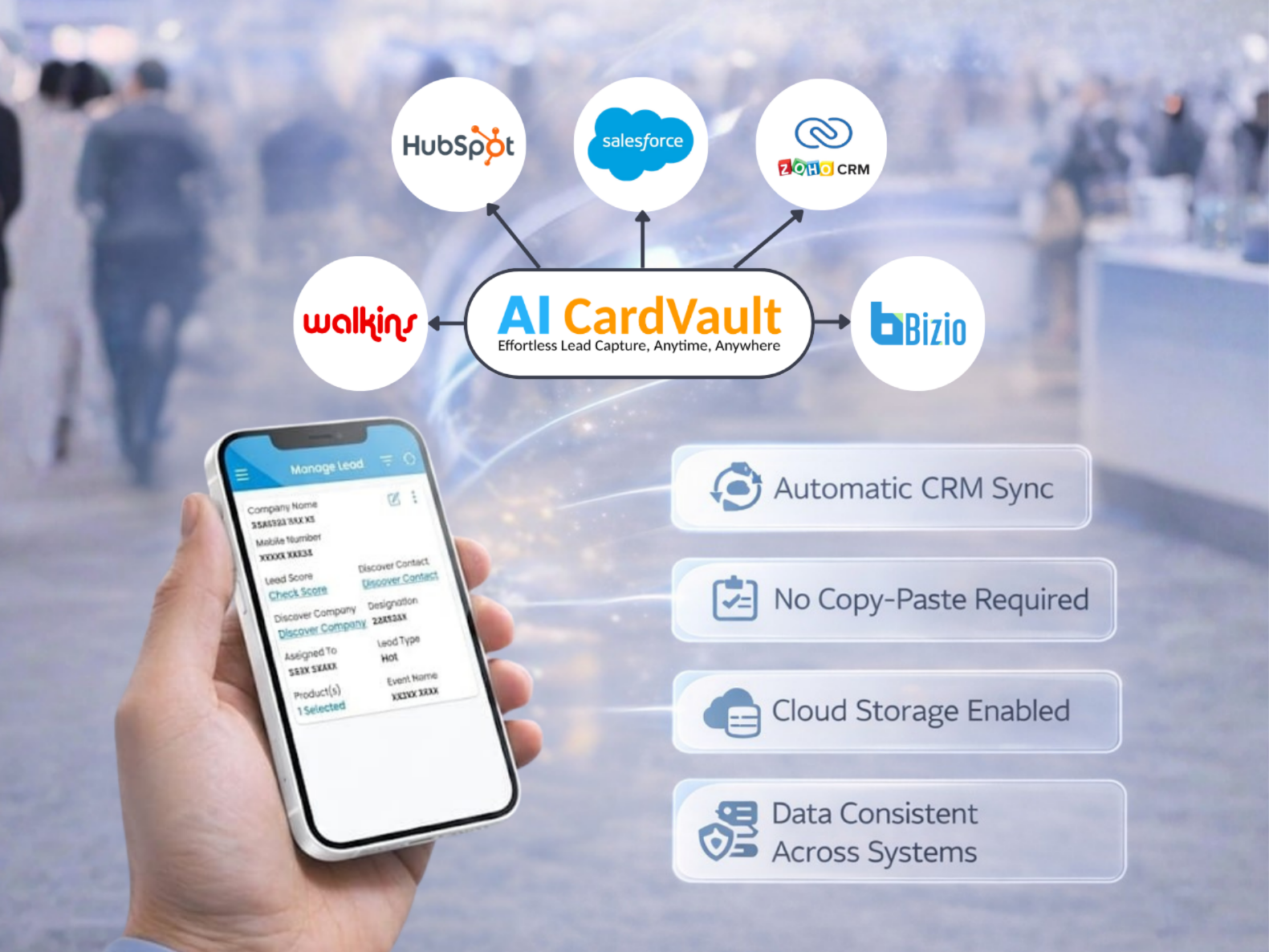 AI CardVault automatically send event leads to your preferred CRM Walkins, Bizio, Salesforce, HubSpot, Zoho, or others so your sales team can act faster without copying, pasting, or manual exports.
