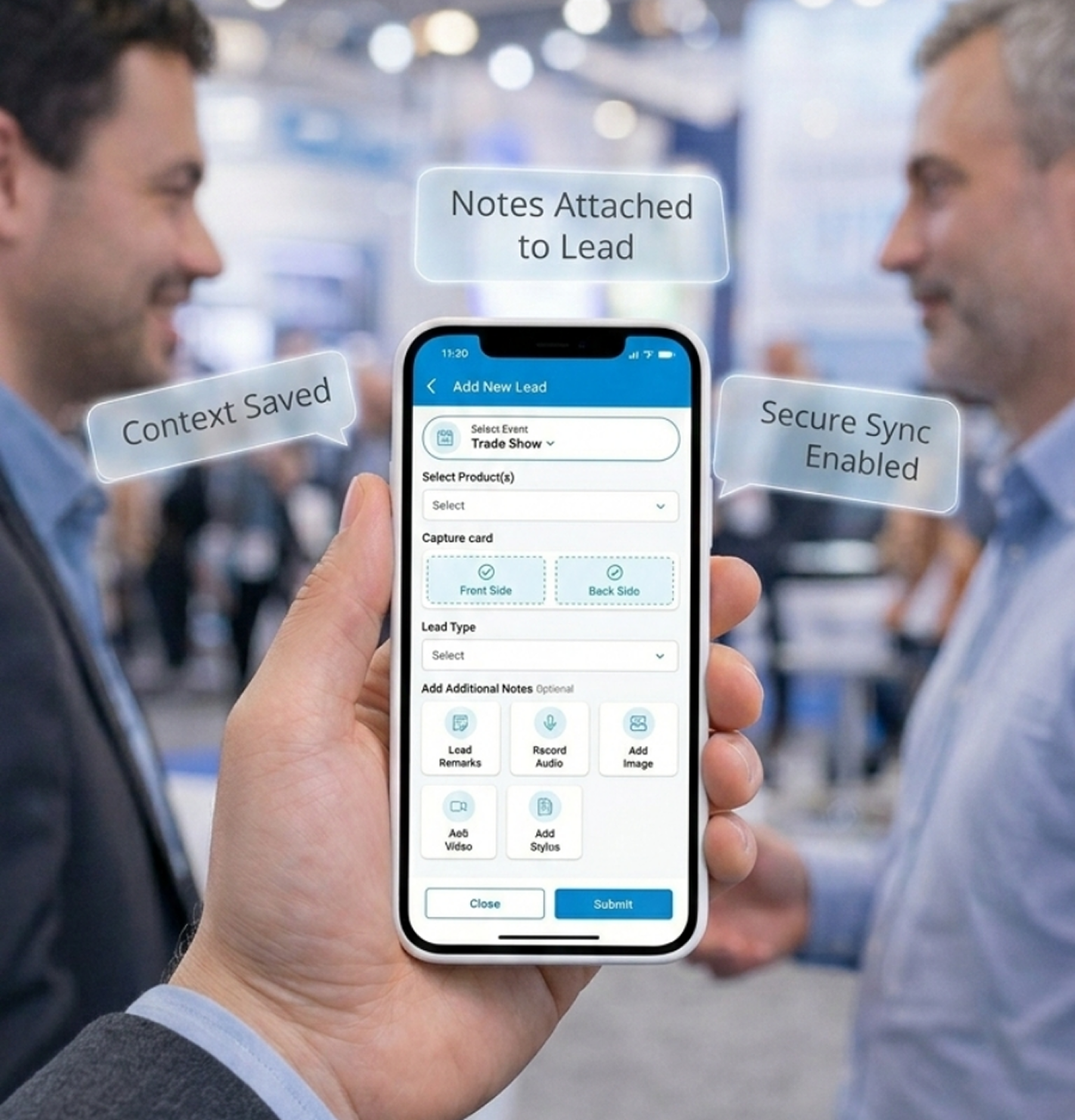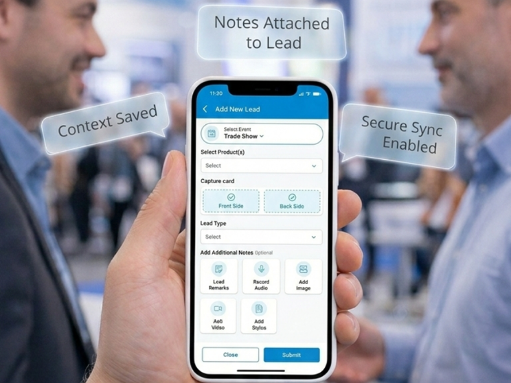 Team members can add voice notes and quick annotations to every lead – during and after conversation, so your sales team remembers not just who they met, but what was discussed and why it matters. These notes stay attached to the lead record and sync securely to cloud storage with seamless syncing.
